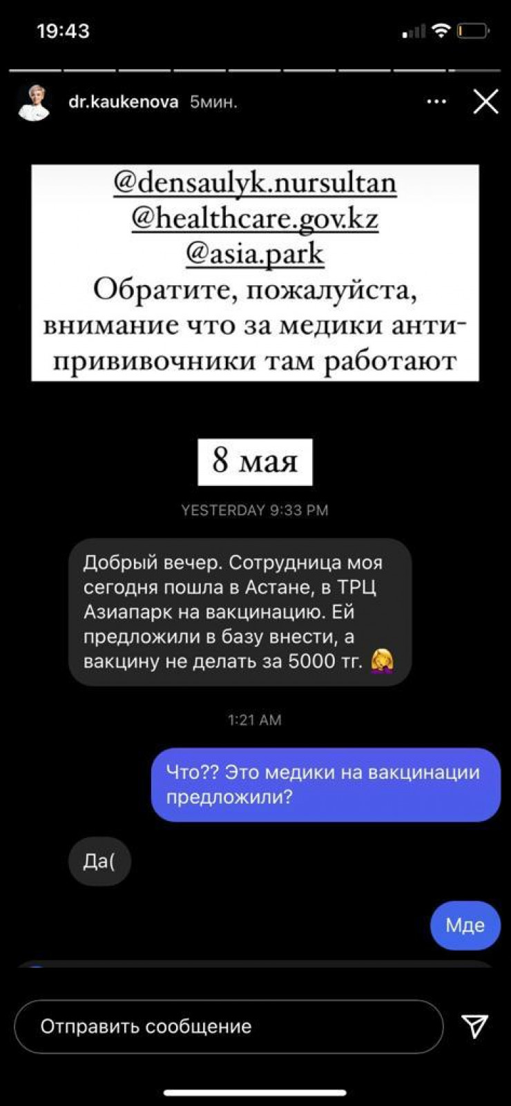 "Сотрудница моя пошла в ТРЦ Asia Park на вакцинацию. Ей предложили в базу внести, а вакцину не делать за 5 тысяч тенге", — рассказала Каукеновой ее подписчица в соцсети.