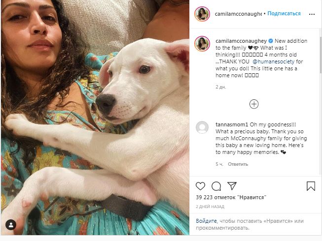 У Мэттью Макконахи пополнение в семье! 38-летняя фотомодель Камила Алвес, супруга звезды «Джентльменов», поделилась трогательным снимком с новым щенком, которого они взяли из приюта, пишет Glamour.ru
