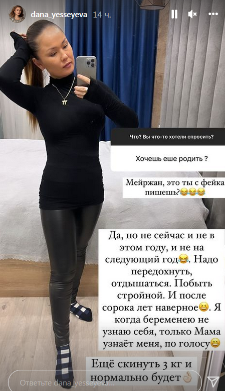 "Мейржан, это ты с фейка пишешь? Да, но не сейчас и не в этом году, и не на следующий год. Надо передохнуть, отдышаться. Побыть стройной. И после сорока лет, наверное. Я, когда беременею, не узнаю себя, только мама узнает меня, по голосу. Еще скинуть 3 кг и нормально будет", — ответила артистка.