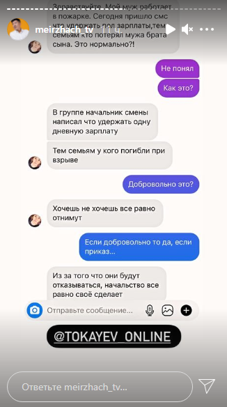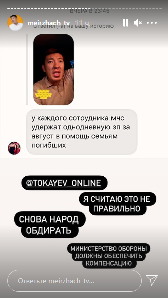 Также кто-то написал блогеру: "У каждого сотрудника МЧС удержат однодневную зарплату за август в помощь семьям погибших". На это Туребаев отреагировал, отметив аккаунт Президента и написав: "Я считаю, это неправильно, снова народ обдирать. Министерство обороны должно обеспечить компенсацию".
