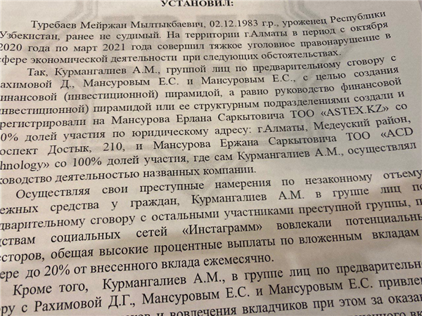 "Установлено, что в период времени с февраля 2019 года по январь 2021 года должностными лицами указанных ТОО с физическими и юридическими лицами заключались договоры о совместной деятельности для вовлечения финансовых средств, якобы необходимых для участия в государственных закупках. Согласно двустороннему документу фирмы, должны были выплачивать 20% от суммы внесенного вклада каждому вкладчику ежемесячно. Денежные средства в размере свыше 2 млрд тенге в ТОО «ASTEX.KZ» от 162 вкладчиков поступали через другую компанию — ТОО «MUDARABAN CAPITAL", — сообщил Рустам Абдрахманов.