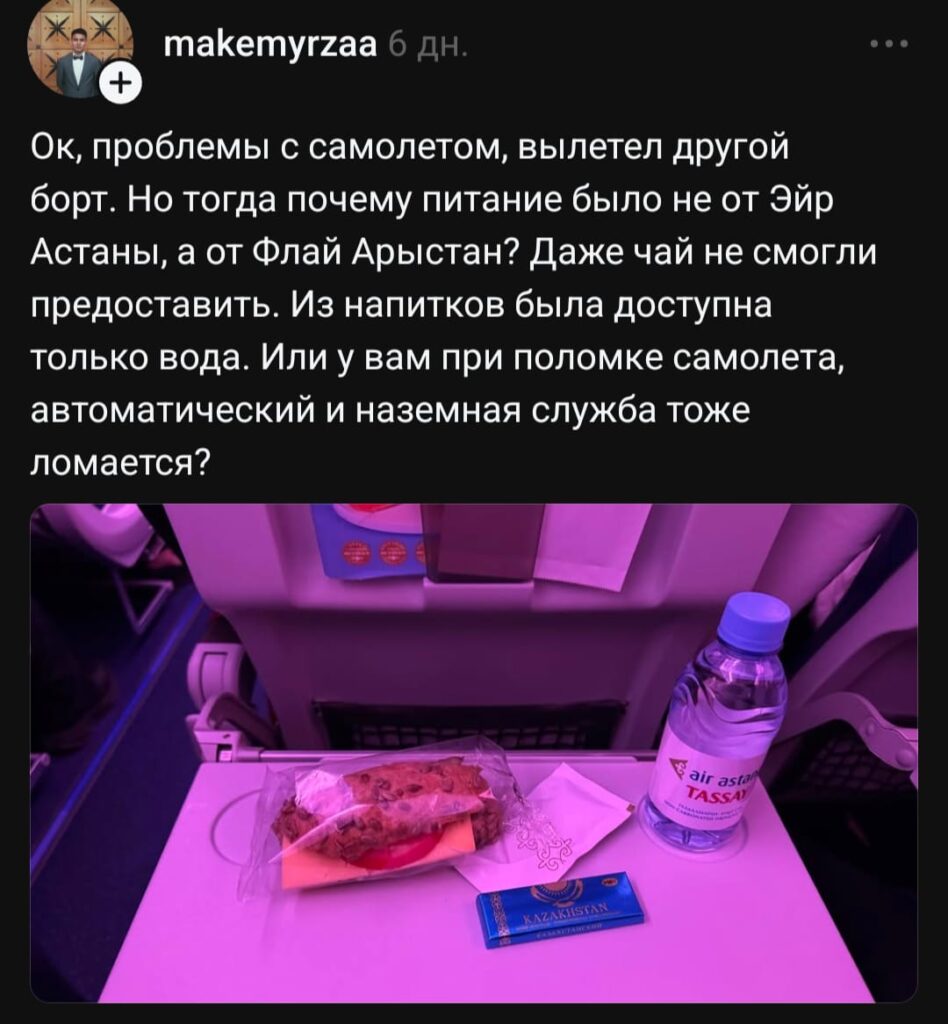 «Ребята, а вы знали, что, когда вы покупаете билеты на рейсы «Эйр Астаны», вы не платите за еду на борту. Оказывается, ее щедро и великодушно предоставляет бесплатно авиакомпания. Как акт милосердия, щедрости и любви к своим терпеливым пассажирам. А вы платите только за перевозку и сборы аэропорта», — отреагировал он.