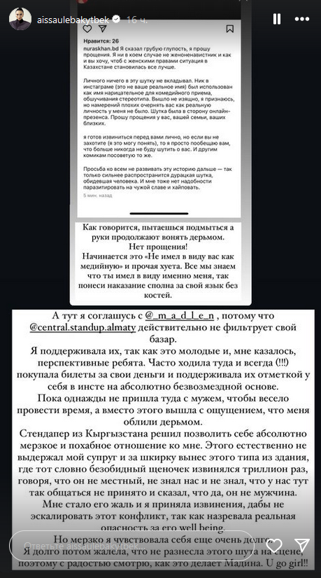 Но мерзко я чувствовала себя еще долго. Я долго потом жалела, что не разнесла этого шута на сцене, поэтому с радостью смотрю, как это делает Мадина. Вперед!» — написала Айсауле.