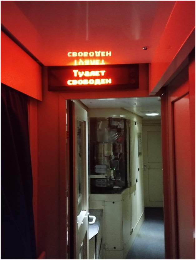 Табло под потолком заботливо сообщает пассажирам время, погоду на улице и внутри вагона и свободен ли туалет.