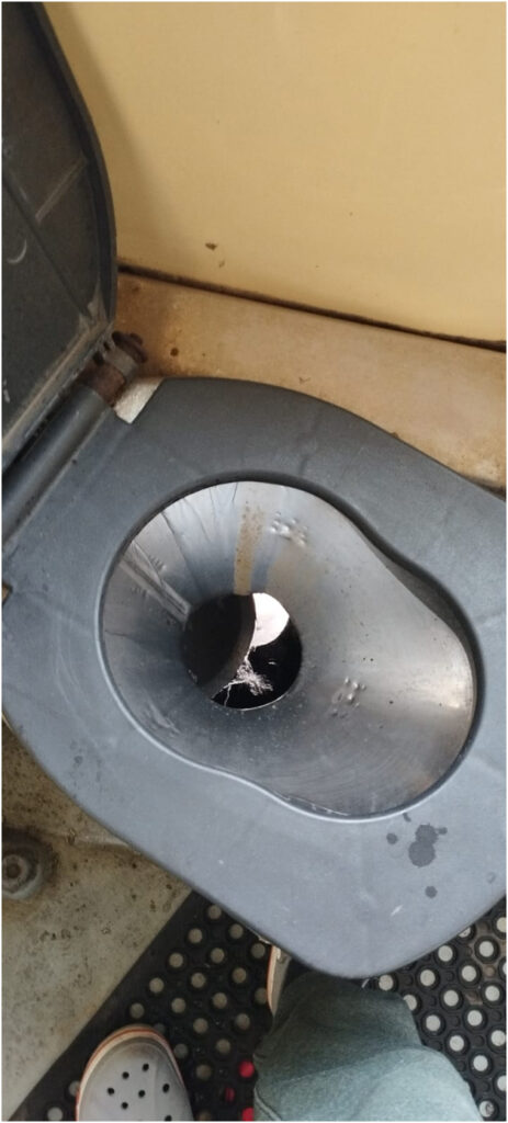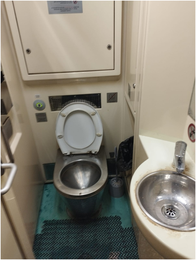 Самих туалетов два, но они убраны в конец вагона, поэтому не особо мешают пассажирам. Это биотуалеты, поэтому ими можно пользоваться даже на стоянке. В старых поездах туалет – это железный трон, под которым дыра в полу. Через нее прямо на рельсы сливаются все отходы жизнедеятельности человека.