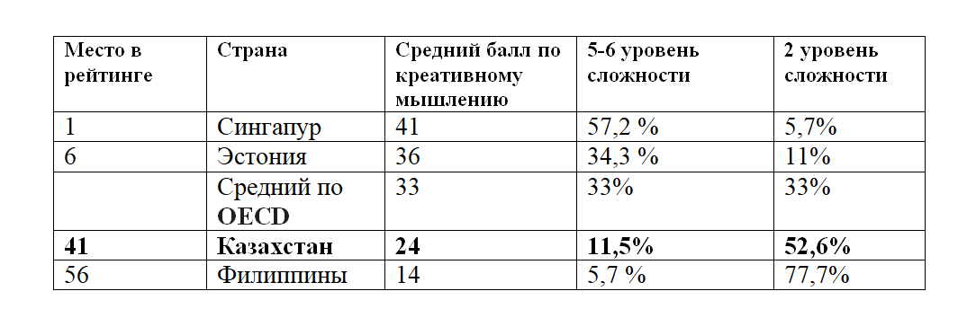 Провальным можно назвать результат Казахстана в 2018 году в измерении глобальных компетенций. Креативное мышление – результат не менее печальный. От среднего показателя всех стран OECD мы отстаем на 9 баллов, от лидера — на 17 баллов. Только каждый десятый школьник показал 5-6 уровни креативного мышления по шкале PISA, в то время как в Сингапуре это каждый второй, в Эстонии – каждый третий.