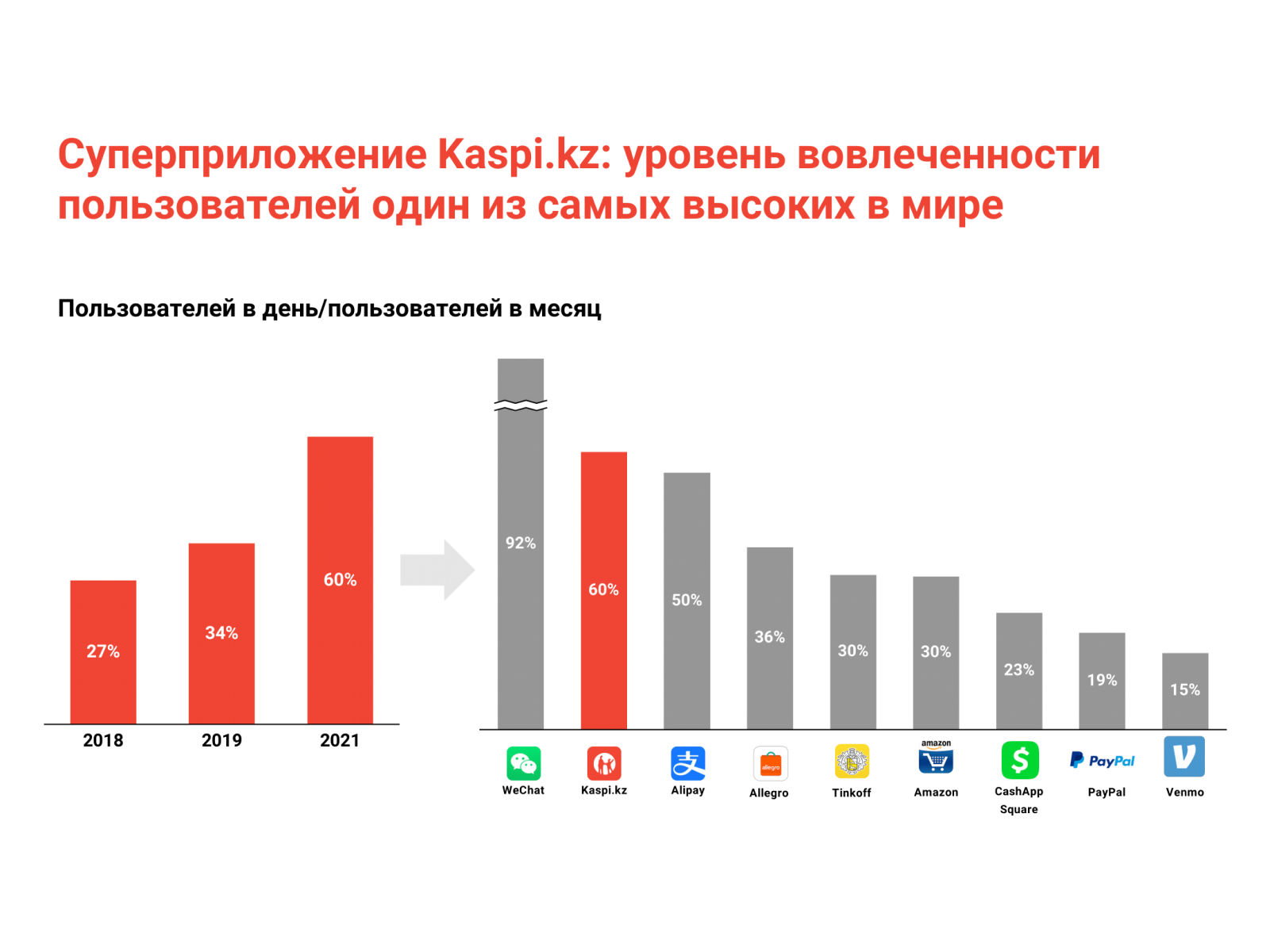 Суперприложением Kaspi.kz пользуются уже более 11 миллионов человек. Из них 6,5 миллиона заходят в приложение ежедневно. То есть, из десяти человек шестеро используют мобильные сервисы Kaspi.kz ежедневно. Уровень вовлеченности составляет 60%, и это один из самых высоких показателей в мире.