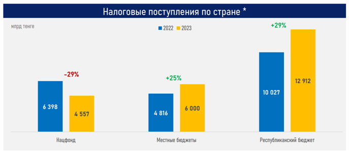 Также выросли более чем в 3 раза по сравнению с 2022 годом неналоговые поступления (1,9 трлн). В основном — из-за роста объема выплат по дивидендам на госпакеты акций (1,1 трлн тенге).