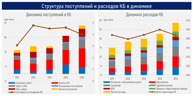 Авторы обзора считают, что с 2019 по 2023 год рост доходов бюджета (104 %) отставал от прироста расходов (191 %). Из-за этого выросли заимствования бюджета (рост в 1,7 раза, до 5,5 трлн в 2023 году) (Ещё один ресурс для "хотелок" правительства). Еще больше правительство вынуло из Нацфонда (20,9 трлн тенге за 5 лет).