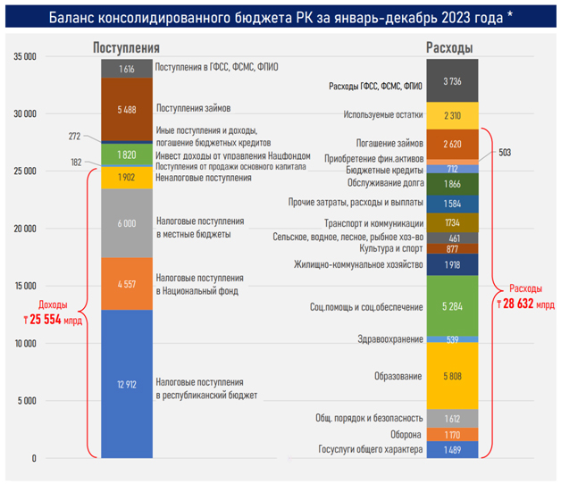 Расходы бюджета в 2023 году выросли на 27 %, или 6,1 трлн тенге — до 28,6 трлн, превышая доходную часть на 12 %, или 3,1 трлн тенге. Такой рост был обеспечен в основном увеличением расходов на погашение и обслуживание госдолга (плюс 1,3 трлн), образование (плюс 1,3 трлн), соцпомощь (788 млрд) и ЖКХ (612 млрд).