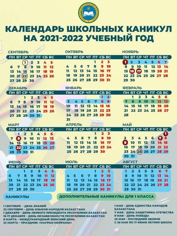 Приказом Министра образования и науки РК утверждены начало, продолжительность и каникулярные периоды 2021-2022 учебного года.