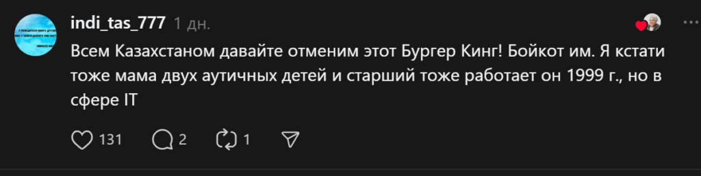 В Threads казахстанка Жанат Картай рассказала историю своего сына, у которого есть расстройство аутистичного спектра. По словам женщины, он четыре года успешно работал в Burger King поваром и был вовлечён в коллектив, но всё изменилось с приходом нового начальника. В ситуации разобрался медиапортал Caravan.kz.