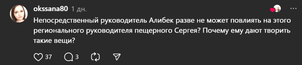«Наша семья будет благодарна всю жизнь за мягкий поддерживающий подход, который обеспечила команда во главе с прекрасным менеджером Ширин Ерлан, непосредственным руководителем Алибека. Но все изменилось с момента, когда пришел новый региональный руководитель Сергей. Началась тихая травля, с осени Алибек был сам не свой, мы не знали, что происходит, пока нам не передали весточку — его вынуждают уволиться…» — пишет Жанат.