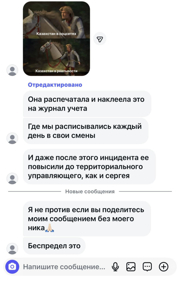 Также Жанат рассказала, что после того, как она поделилась своей историей, ей написал ещё один человек, представившийся бывшим сотрудником Burger King. Она опубликовала скриншоты из переписки:
