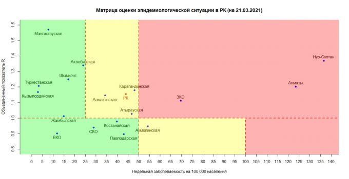 Матрица оценки эпидемиологической ситуации в регионах Казахстана на 21 марта 2021 года.