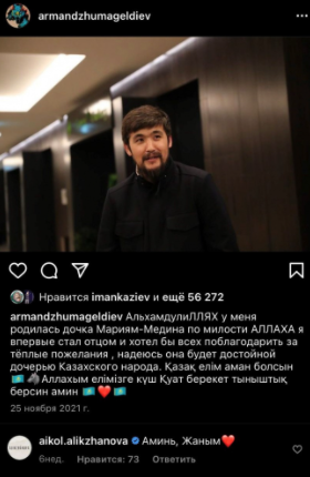 25 ноября Арман Джумагельдиев сделал пост на странице в Instagram, в котором написал о том, что стал отцом. СМИ решили, что Айколь Аликжанова выдала себя, прокомментировав эту запись: "Аминь, жаным".