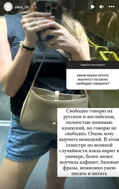 "Свободно говорю на русском и английском, полностью понимаю на казахском, но говорю не свободно. Очень хочу выучить немецкий. В этом семестре по великой случайности взяла иврит в университете, более-менее выучила алфавит, базовые фразы, немножко умею писать и читать", — ответила девушка.