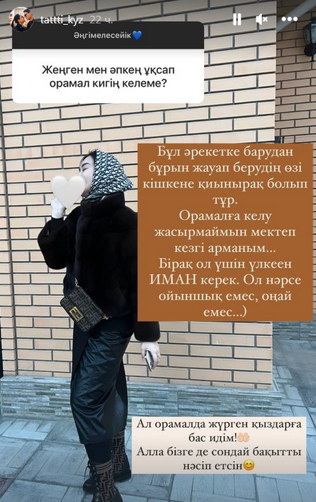 "Мне несколько сложно отвечать на этот вопрос. Не буду скрывать, прийти к платку — моя мечта со времен школы. Но для этого нужна огромная вера. Это не игрушка, это не легко", — ответила девушка.