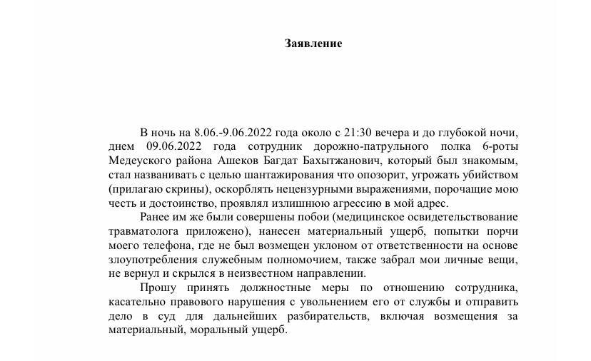 В посте есть несколько скриншотов. В заявлении девушка рассказывает, что в июне подвергалась оскорблениям и агрессии со стороны сотрудника полиции, а в апреле этого года он и вовсе избил её — она прикладывает заключение травматолога, судя по которому у обратившейся был ушиб мягких тканей.