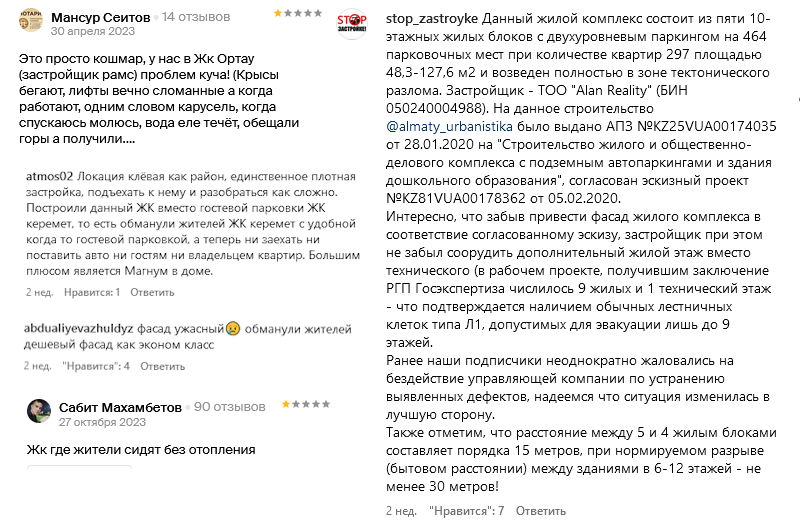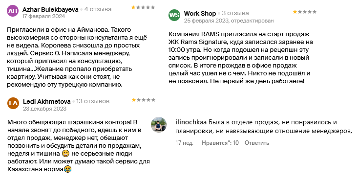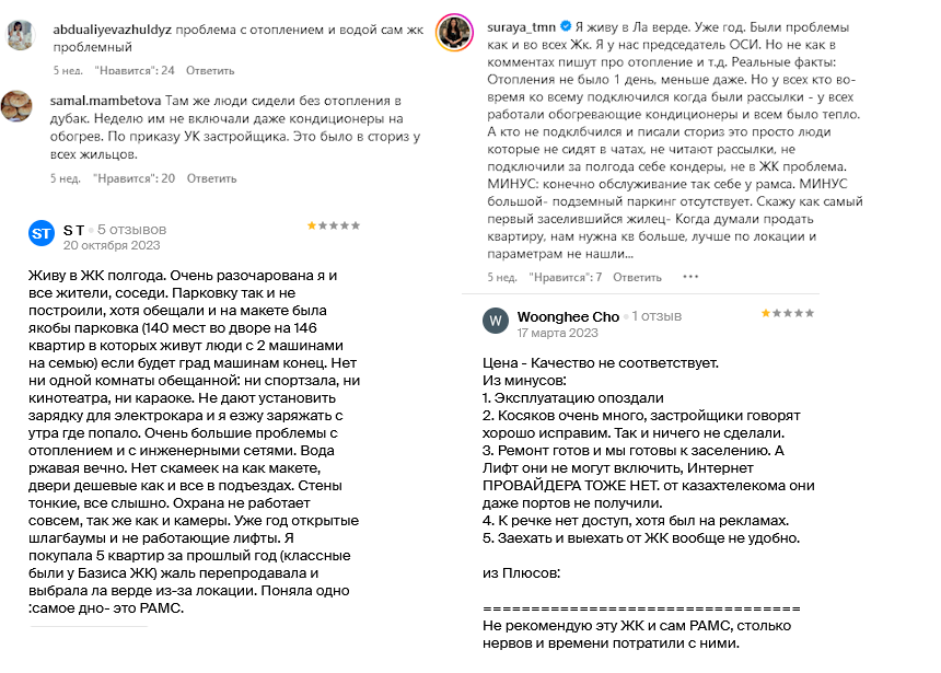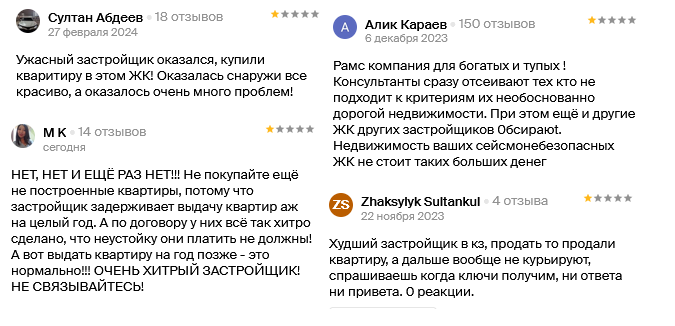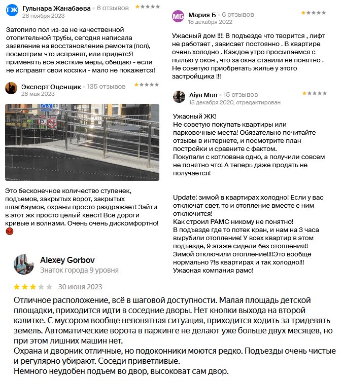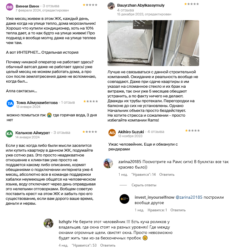 Например, в случае с RAMS City речь идет о невыполненными обещаниях застройщика, который в том числе так и не обеспечил район школой. Но что еще ждет будущих жителей этих ЖК? Ответ можно найти в комментариях тех, кто уже поселился в домах, построенных компанией. Редакция медиапортала Caravan.kz собрала самые показательные из этих комментариев.