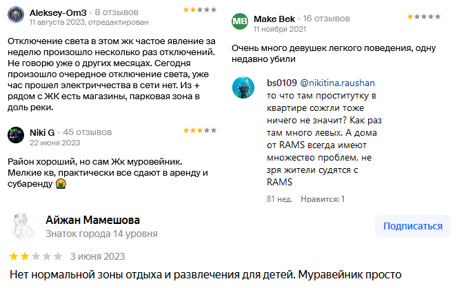 Жалобы в целом разнятся, но есть и общее место — большое количество квартир, которые сдаются в аренду, и при этом их мало кто контролирует, что приводит к ужасным случаям. Так, многих шокировала история с жестоким убийством секс-работницы в одной из съемных квартир в этом ЖК.