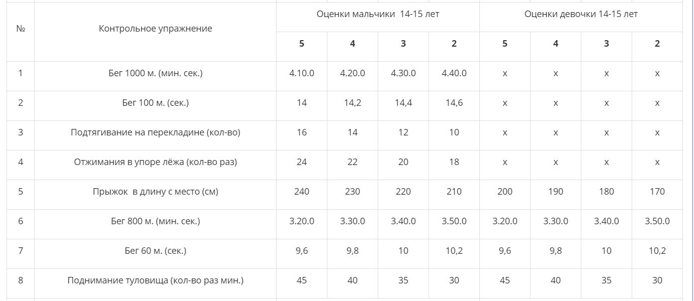 Рассмотрим нормативы второй ступени ГТО, рассчитанной на подростков 14-15 лет, и современные требования к казахстанским подросткам не общеобразовательной, а специальной спортивной школы.