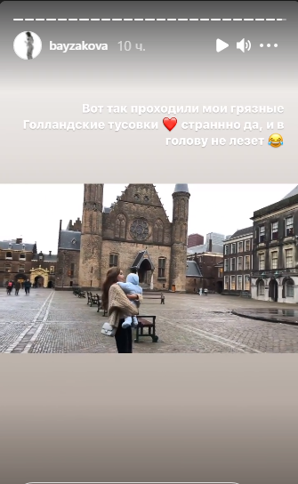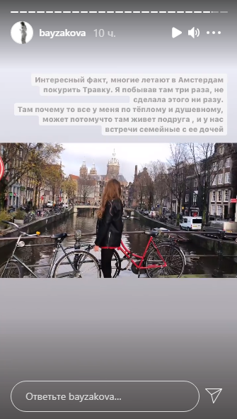 "Интересный факт, многие летают в Амстердам покурить травку. Я, побывав там три раза, не сделала этого ни разу. Там почему-то всё у меня по-тёплому и душевному, может, потому, что там живёт подруга, и у нас встречи семейные с её дочей", — подписала Байзакова один сториз.