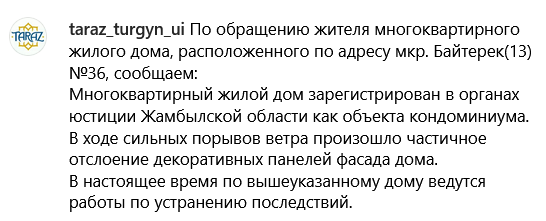 Ситуацию прокомментировал представитель отдела жилищных отношений акимата Тараза.
