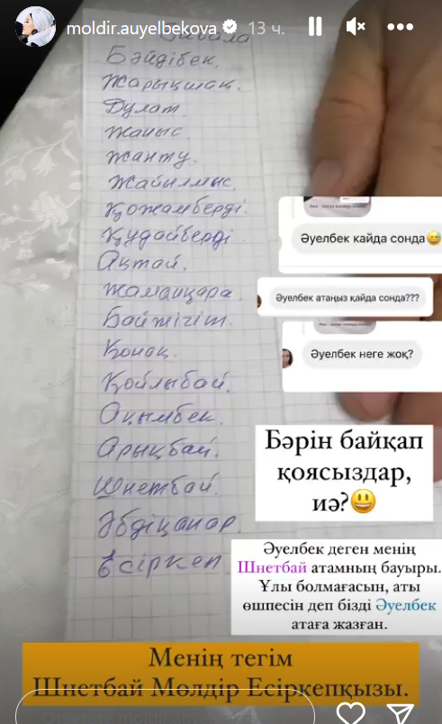 "Вы все замечаете, да? Ауелбек был братом моего прадеда Шнетбая. У него не было сыновей, поэтому, чтобы его род не прервался, прадед записал нас на Ауелбека. Я должна быть Шнетбай Молдир Есиркепкызы", — пояснила певица.