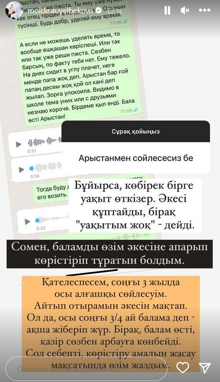 В ответ артистка выложила скриншот переписки с ним в WhatsApp. На скриншоте видно, что она просит Арыстана определиться, будет ли он общаться с их ребенком, так как мальчику тяжело из-за непостоянного присутствия отца в его жизни. По словам Молдир, он плачет и спрашивает, почему у него нет папы. Когда мать напомнила ему про Арыстана, ребенок снова расплакался и заявил, что нет же. Далее Молдир пишет, что еле успокоила сына, и требует что-то сделать. Арыстан ответил ей голосовыми сообщениями.