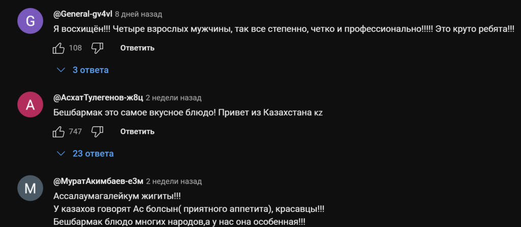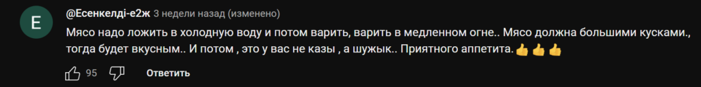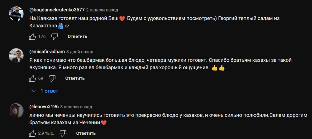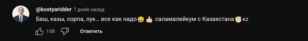 «Готовим блюдо степных народов — бешбармак!» — написано в описании. На видео блогер готовит на открытом огне. В казане он отварил мясо баранины с казы, луком и морковью, ещё он использовал жайму.
