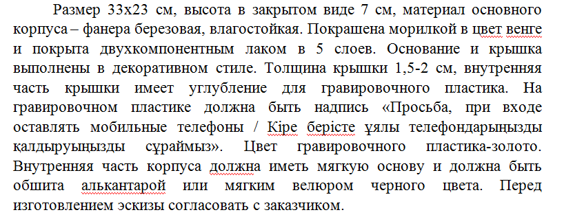 При этом размеры ящика — всего 33 на 23 сантиметра, его высота в закрытом состоянии 7 сантиметров. Он покрашен морилкой в цвет венге (золотисто-коричневый, тёмно-коричневый с чёрными прожилками. — Прим. ред.). На крышке золотым пластиком выполнена надпись с просьбой оставить мобильные. По небольшому объему ящика можно предположить, что он установлен не на входе в само здание Антикора, а, скорее, в приемной одного из руководителей. Однако точной информации о его расположении нет.