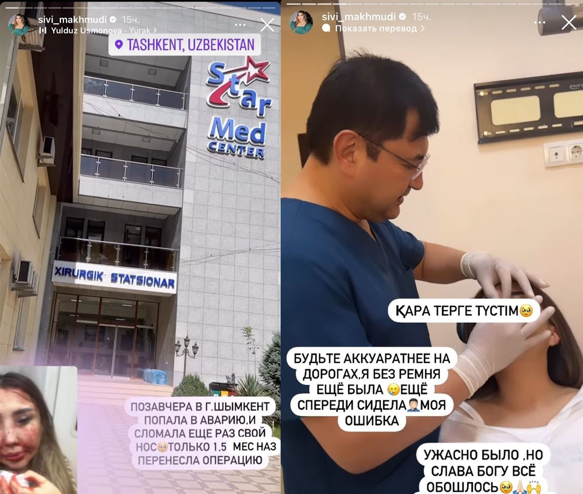 "Позавчера в Шымкенте попала в аварию и сломала еще раз свой нос. Только 1,5 месяца назад перенесла операцию.