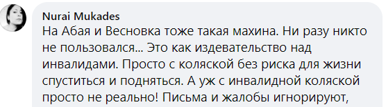 "Вчера на Саина/ниже Шаляпина пыталась воспользоваться подъемником на мосту, потому как детскую коляску по ступенькам не затащить. На вид подъемник рабочий, кнопки есть, но то ли не работает, то ли механизм уровня башенного крана, в общем, он не заработал. Инструкции, знаков, куда и в какой последовательности нажимать, нет. Для чего и кого стоит, непонятно", — пожаловалась жительница Алматы Алия Шишова.