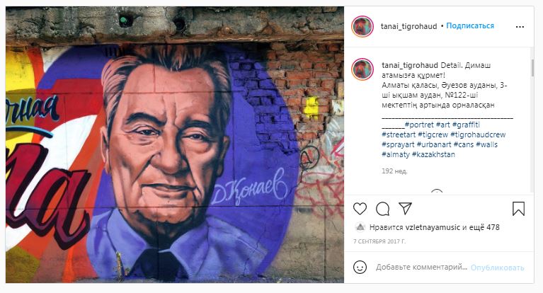 Мурал появился в сентябре 2017 года. Увидеть его можно в 3-м микрорайоне Алматы.
