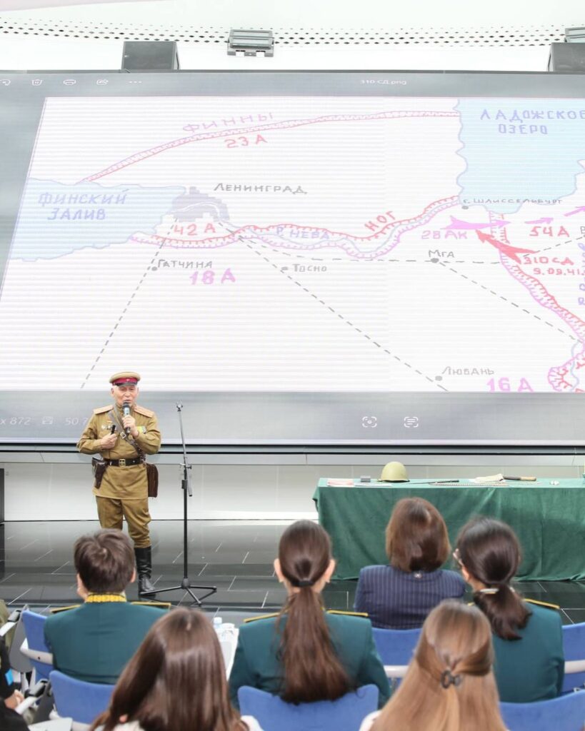 Одним из почетных гостей мероприятия был Майдан Комекович Кусаинов. Он является профессором, руководителем поискового отряда. Благодаря его усилиям были установлены имена многих бойцов, погибших в боях. Майдан Комекович продолжает руководить отрядом, который на протяжении многих лет ведет поисковые работы на Синявинских болотах и высотах под Санкт-Петербургом.