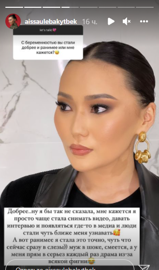 Бакытбек ответила: "Добрее… Ну, я бы так не сказала, мне кажется, я просто чаще стала снимать видео, давать интервью и появляться где-то в медиа, и люди стали чуть ближе меня узнавать. А вот ранимее я стала, это точно, чуть что, сразу в слёзы. Муж в шоке, смеётся, а у меня прям всерьёз каждый раз драма из-за всякой фигни".