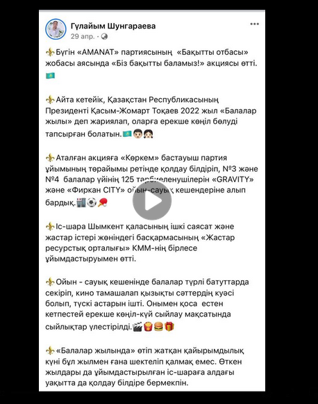 "Этот мужчина на видео оказался сыном члена шымкентского отделения партии "Аманат", кандидата в депутаты Гулайым Ш.! Девушка попросила меня о помощи через Instagram, она пожаловалась, что родственники препятствуют ходу уголовного дела.