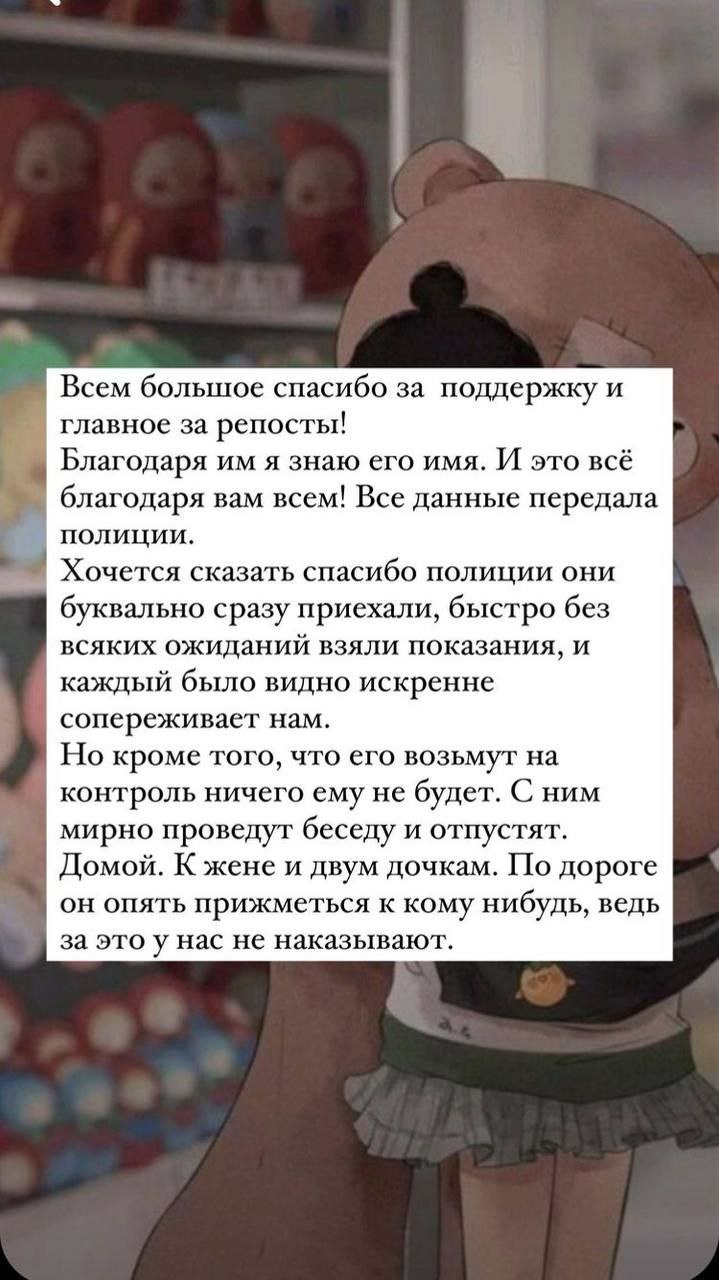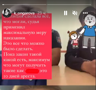 Мама девочки прокомментировала ситуацию: "Полиция сделала всё, что могла, судья применил максимальную меру наказания. Это всё, что можно было сделать. Пока закон такой, какой есть, максимум, что могут получить такие, как он, это десять дней ареста. Он не ожидал, что дело примет такой оборот. Не ожидал, что домой сегодня не попадёт. Но меня, как маму двоих малолетних детей, его десятидневный отдых от основного вида деятельности за мой счёт и счёт других налогоплательщиков не удовлетворяет".