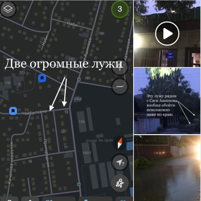 "Здравствуйте. Кто отвечает за этот участок дороги? Улица Чойбалсан, микрорайон Айгерим, между магазином и улицей Саги Ашимова.