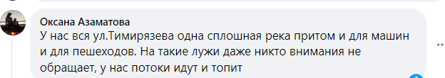"У нас вся улица Тимирязева одна сплошная река, притом и для машин и для пешеходов. На такие лужи даже никто внимания не обращает, у нас потоки идут и топит", — написала другая участница группы.