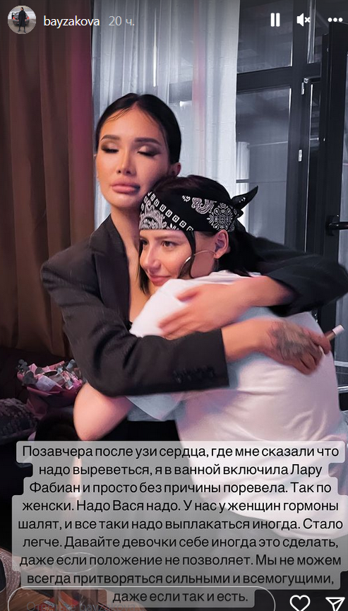 "Позавчера после УЗИ сердца, где мне сказали, что нужно выреветься, я в ванной включила Лару Фабиан и просто без причины поревела. Так по-женски. Надо, Вася, надо. У нас, у женщин, гормоны шалят, и все-таки надо выплакаться иногда. Стало легче. Давайте, девочки, себе иногда это сделать, даже если положение не позволяет. Мы не можем всегда притворяться сильными и всемогущими, даже если так и есть", — написала Айжан в сториз.