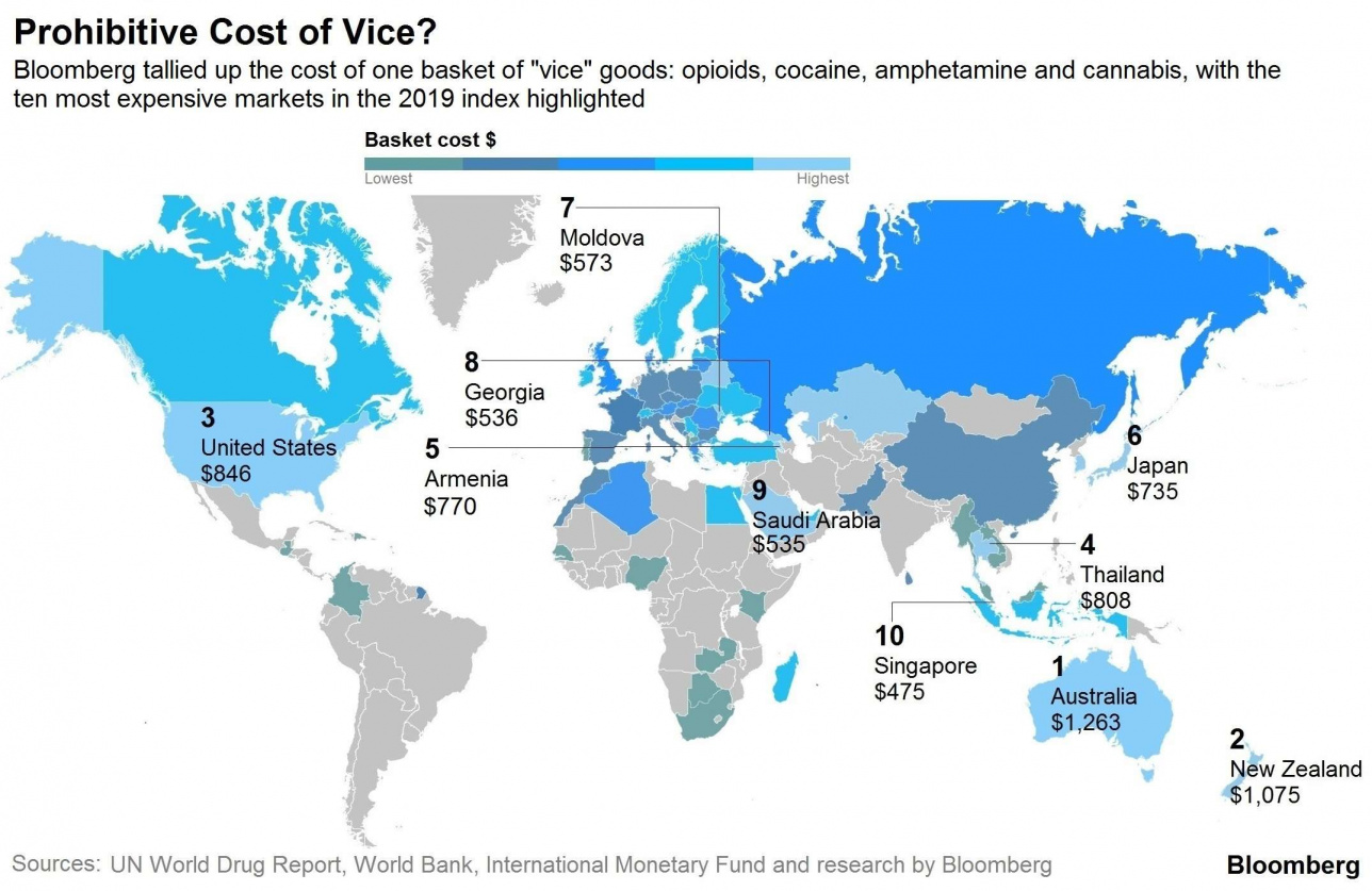 Рейтинг «Корзины греха» составляется с учётом предполагаемых затрат на «стандартный запас наркотиков» – грамм кокаина, амфетамина, марихуаны и грамм опиоидов. И стоимость такого набора сравнивается со средним недельным заработком гражданина.