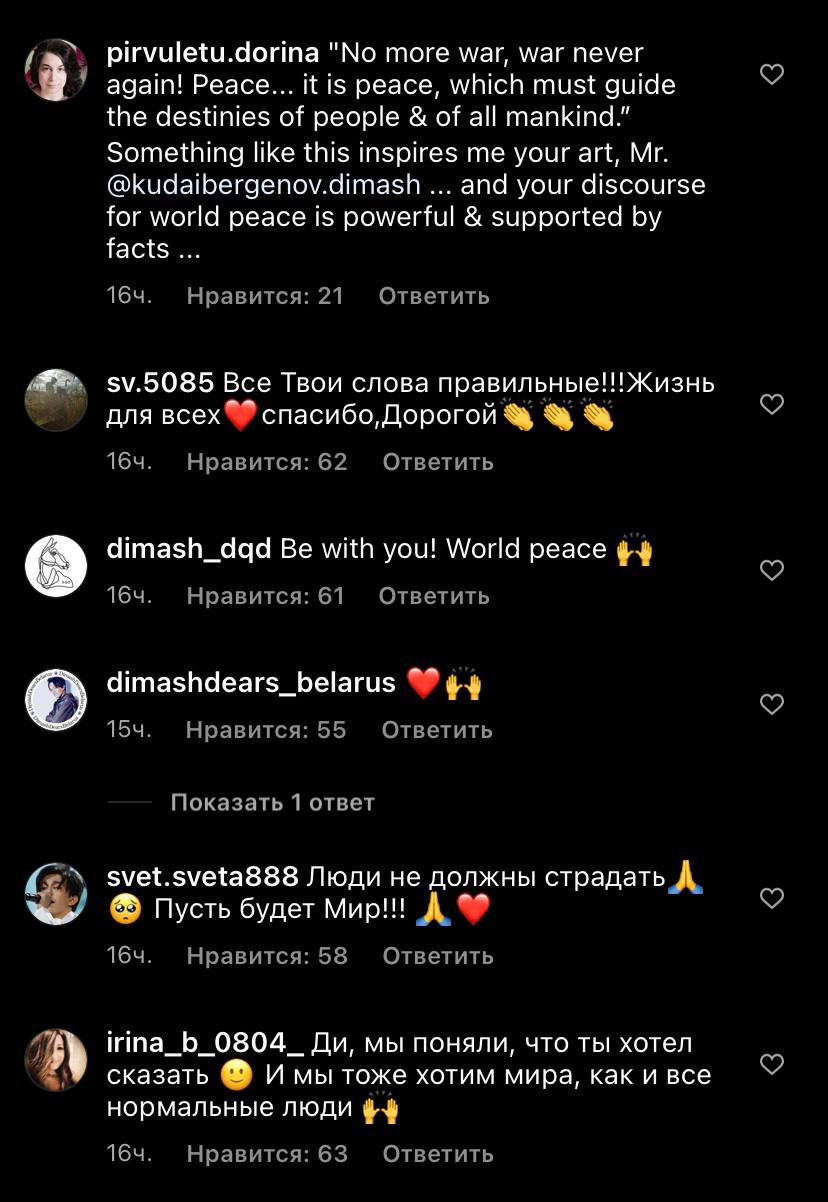 «Надеюсь, вы со мной. Я против войны. Пусть будет мир во всем мире. Люди не должны страдать от действия сумасшедших президентов. Точка!» — обозначил свою позицию знаменитый казахстанец, снискав воодушевление и поддержку своей аудитории.