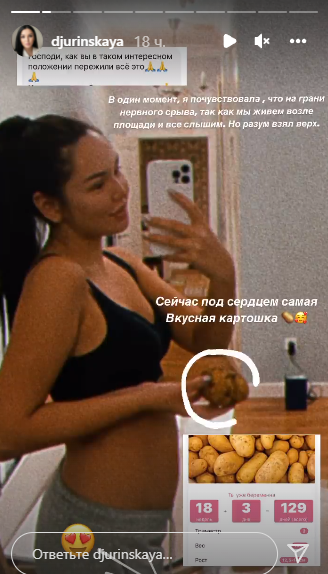 Актриса ответила: "В один момент я почувствовала, что на грани нервного срыва, так как мы живём возле площади и всё слышим. Но разум взял верх. Сейчас под сердцем самая вкусная картошка".