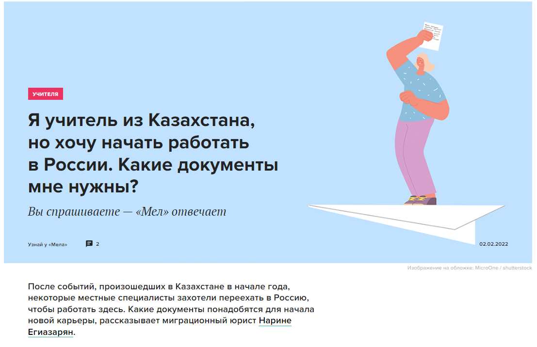 В материале под заголовком «Я учитель из Казахстана, но хочу начать работать в России. Какие документы мне нужны?» авторы пишут, что «после событий, произошедших в Казахстане в начале года, некоторые местные специалисты захотели переехать в Россию, чтобы работать здесь», и приводят пояснения миграционного юриста Нарине Егиазарян о том, какие документы понадобятся для начала новой карьеры.