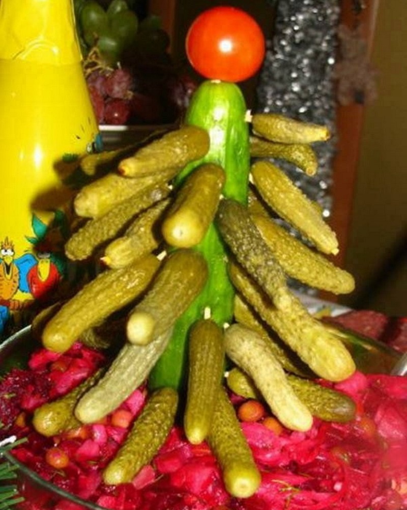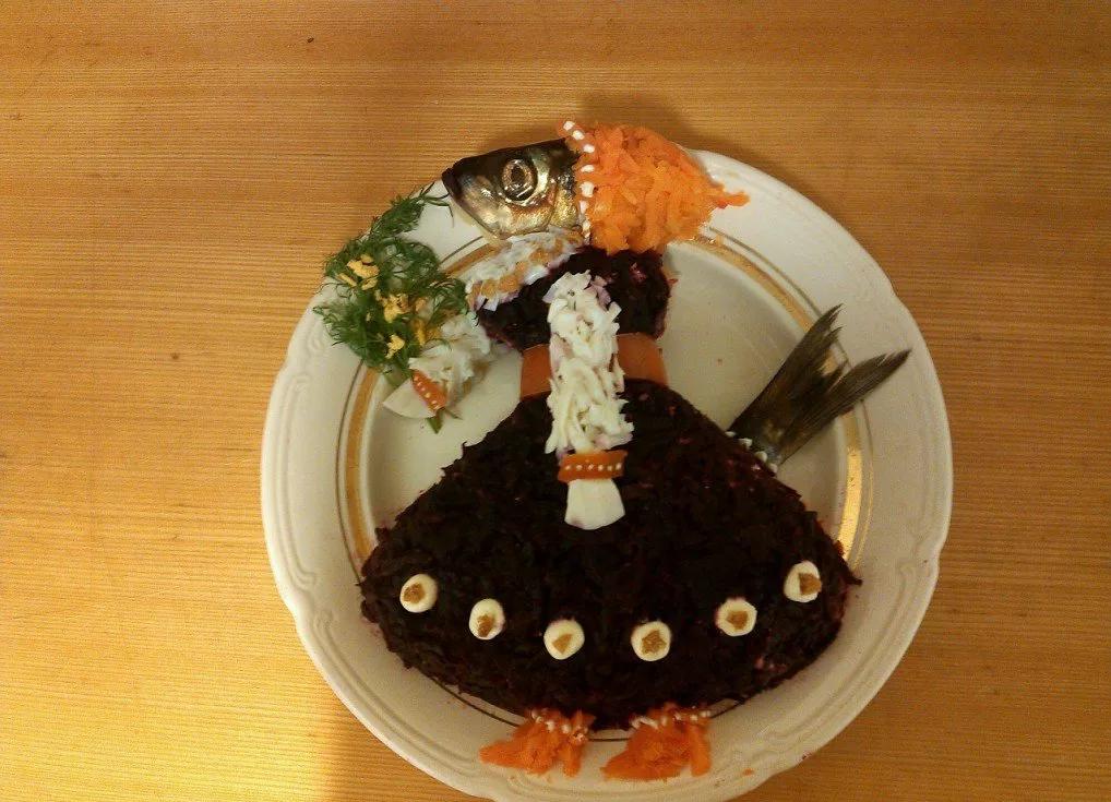 Второе по популярности новогоднее блюдо, селёдка под шубой, тоже не избежало глумления. Автор рецепта решил воспроизвести название буквально. Вылепить шубу из салатной массы оказалось нетрудно, «сапожки» из тёртой моркови вылепит и ребёнок, а вот на голове модницы креатив «кулинара» иссяк. Иначе не объяснить, почему он предложил украсить салат селёдочной башкой в шапочке из остатков моркови.