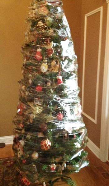 Лучшие умы интернета предлагают прикрутить новогоднее дерево к потолку. Дескать, так и оригинальнее, и можно не опасаться, что до неё доберутся кошки и спиногрызы. Другие советуют поставить ёлку в клетку. Только они не уточняют, нужны ли ещё колючая проволока под током и вышка с Дедом Морозом, который бы играл на губной гармошке «Ach, du lieber Augustin». Третьи — вообще обмотать её скотчем вместо мишуры. Один из тонких знатоков кошачьей психологии вспомнил, что мурлыки боятся огурцов. Значит, чтобы обезопасить новогоднее дерево от наглых мысыков, надо украсить нижние ветви огурцами. Из того же разряда — разбросать вокруг ёлки мандарины (кошачьи не любят запах цитрусовых) или обрызгать ель духами с ароматом апельсина.