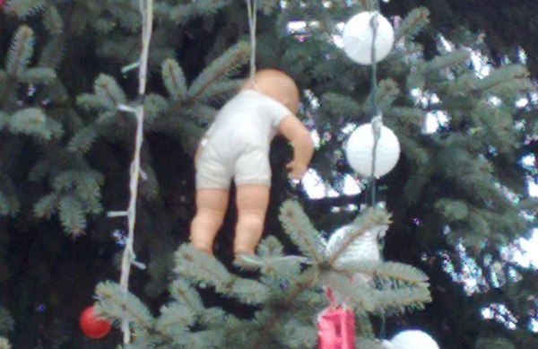 Старыми вещами можно украсить ёлочку без лишних затрат. Это мы знаем из мультика про Простоквашино. Так на ёлку и попадают CD-диски, пластиковые стаканчики, перегоревшие лампочки, аптечные пузырьки. Всего-то надо размалевать их гуашью или оклеить цветной изолентой. Одна из креативных мамаш предложила украсить ветви куклами. Идея оригинальна, если бы не её воплощение. К совету прилагалось фото пупса, надёжно подвешенного за шею. Останки Барби тоже смотрелись не лучшим образом. Такой декор вызывает ассоциации, скорее, с Варфоломеевской ночью, чем с новогодней. Или с утром стрелецкой казни.