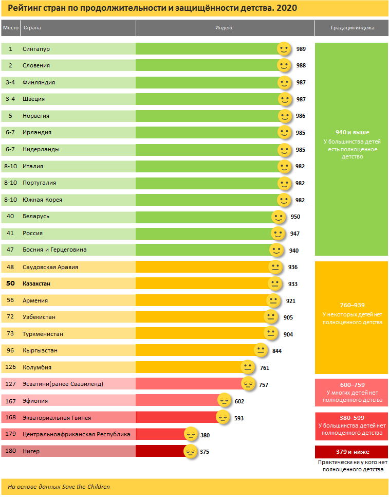 В рейтинге стран по продолжительности и защищенности детства Казахстан занял 50-е место из 180 стран, сообщает Finprom.kz.